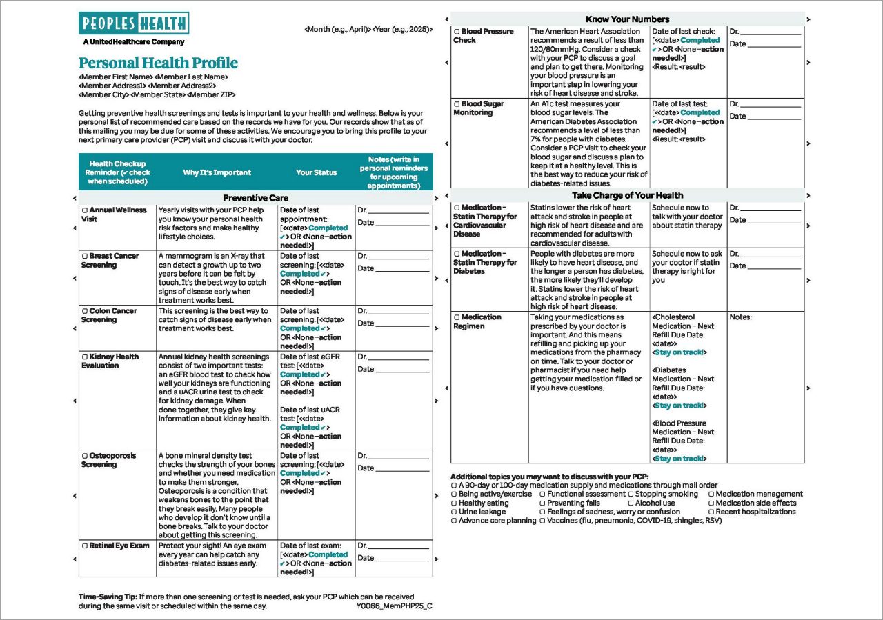 We’ve designed a personalized health profile for Peoples Health members who may be due for key health activities related to 11 quality star measures for 2025. Members who are eligible and noncompliant for at least one of the measures will be sent a health profile via mail in May. The profile:
